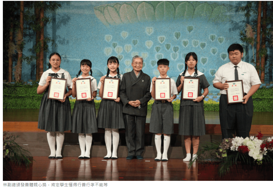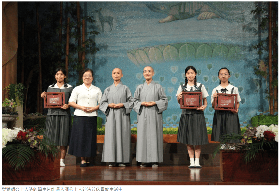 本次獲頒 師公上人獎的同學為江泊葦、李明靜、許琪恩,因將慈悲與善行落實於生活、把握因緣付出無所求,而受推薦獲獎。其中來自馬來西亞的許琪恩兩歲即隨著家人投入環保志工,從慈小一路讀至慈中,期間除學習認真,更參加各類志工服務及交流活動,也長期練習國術,在接連的三個階段畢業時,皆獲得 師公上人獎的肯定。依著對中藥學的喜愛,今年以優異表現錄取慈濟大學藥學系,將成為該系所第一屆學生。