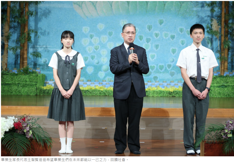 畢業生家長代表王智賢爸爸,今年家中有兩位畢業生。一位是錄取慈大醫學系的王祥呈,他亦曾以中藥萃取物為主題榮獲全國科展賽第二名。另一位是王韻棠,她在今日公布的會考成績中獲得5A佳績。王爸爸在致詞時,特別感恩學校用心於品德教育,讓孩子人文及品德兼備,亦感恩慈誠懿德爸媽每月蒞校,陪伴孩子走重要的人生路。他也藉「叮嚀」一曲的歌詞,「把夢鋪在地上,把心擲向雲端,讓理想在天空展翅飛翔;把手伸向遠方,把愛散播十方,膚慰人間苦難與滄桑。」希望畢業生們在未來都能以一己之力,回饋社會。