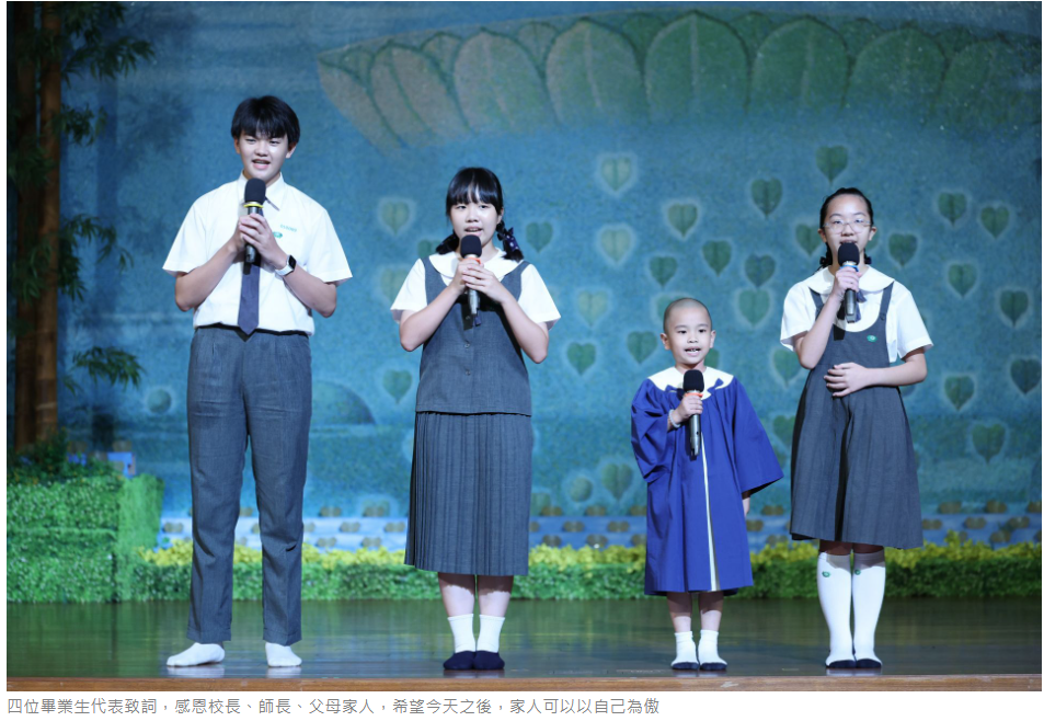 畢業生致詞分別由郭誠智、江泊葦、林芊逸、柯劭穎代表幼兒園、小學、國中、高中四個部別,以國語、台語、英文大方而自信地表達愛與感恩,細數在學校學習成長的點滴,回顧自己的蛻變。