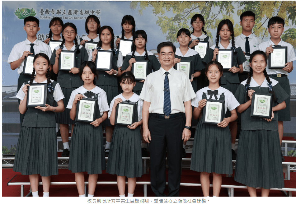 臺南慈中辦學績優、深耕人文,更是品德教育特色學校,備受家長肯定。六年感恩班洪磊恩媽媽分享:磊恩的姊姊從小學直升國中部,倆孩子六年來的成長,讓其聽到磊恩自願直升,可以很放心將小孩交給學校。國三互愛江彥叡同學第一次接受慈濟學校畢業典禮洗禮,其表示畢業典禮的方式與眾不同,獨創一格──莊嚴感恩氣氛,且重視每位學生:讓我們一一親自上台領取畢業證書。正如磊恩媽媽所言:選擇學校的條件──「環境」是我的考量首選。相信慈濟學校的友善校園氛圍與老師的用心指導,會使所有畢業生永誌臺南慈中的點點滴滴。