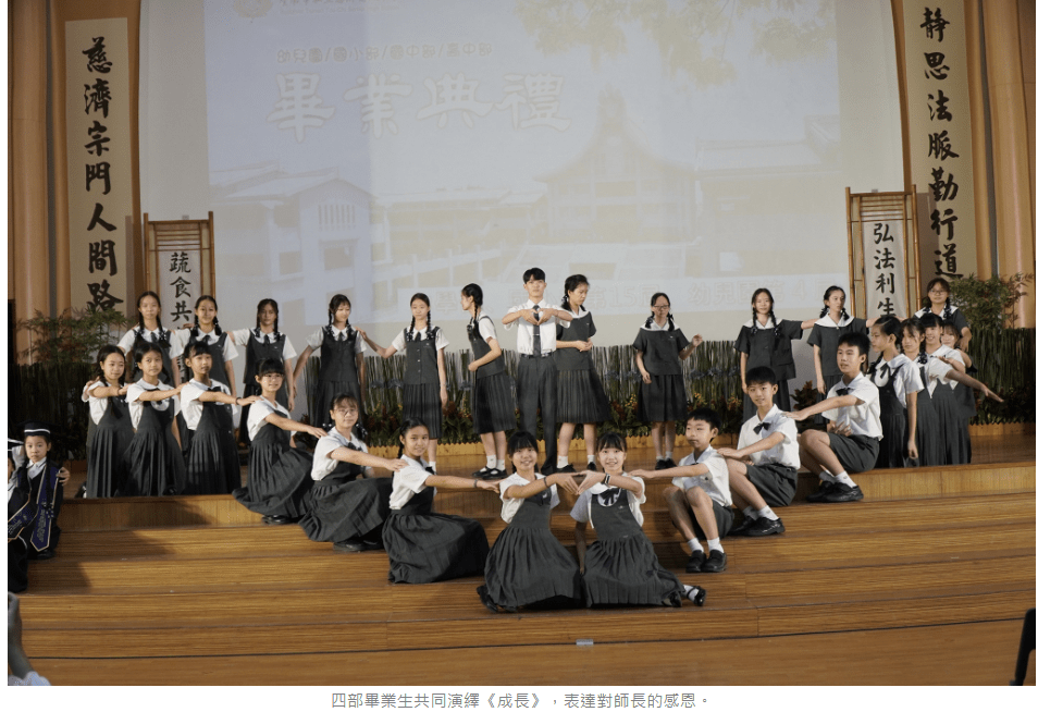 這次畢業典禮包括幼兒園、國小、國中、高中四部畢業生共計502位畢業生,透過領取畢業證書時深深一鞠躬來感恩父母師長陪伴、教誨。德霈師父、德愔師父更遠從花蓮捎來祝福,期盼學子懂得付出、助人,人生路途貴人不斷。證嚴上人透過影片給予祝福:感恩學校老師認真扎實地教導,親子師生和氣融融這就是教育,勉勵大家知福滿足、行善行孝,再接再厲。