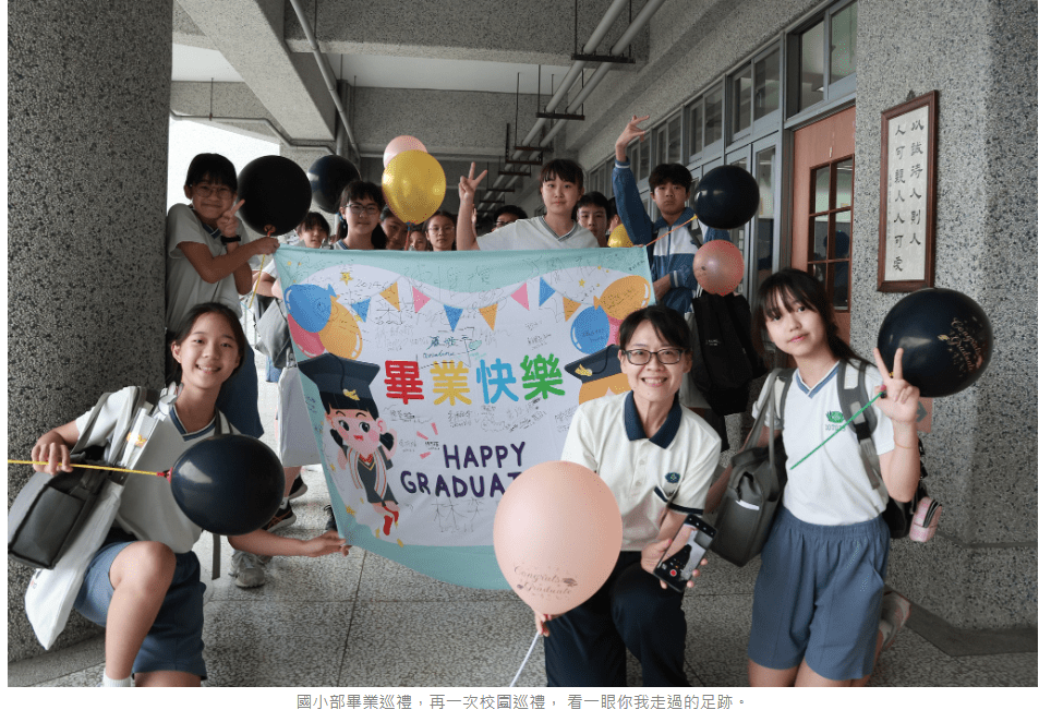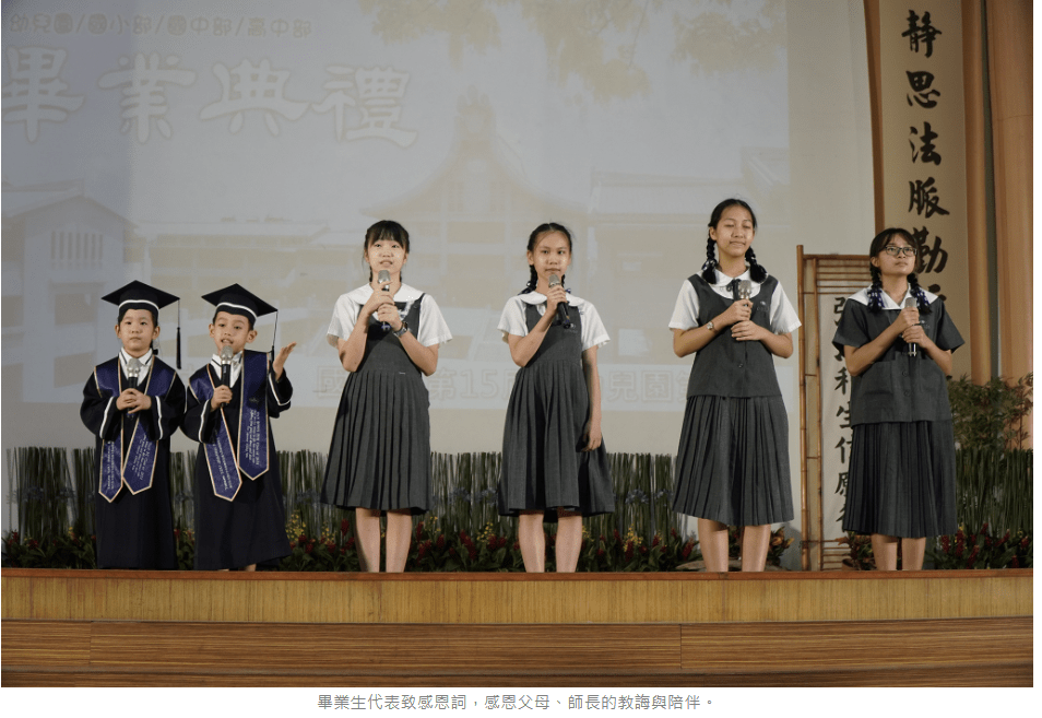 畢業是另一成長旅程之開端,由四部畢業生及師長共同以手語歌《成長》演繹孩子的成長蛻變。幼兒園Tr. Geraldine老師感動分享孩子們初初來到幼兒園時,都需要很多老師的協助和教導,現在他們除了照顧自己,還可以照顧身邊的人甚至協助老師。國小賴瑋真老師不捨地表示:兩年來一幕幕共學的課堂風景,成就出更不一樣的人生風景。國中余志誠老師感性說道:從國一新生懵懂、國二曾文青年活動中心隔宿露營、國三的戶外教育畢業旅行,不斷茁壯蛻變,一起在會考倒數的沉重氣氛中,眼看著日曆一張一張撕下,仍耕耘不輟,如今終可歡喜收割。高中郁佳老師則期許同學們帶著老師諄諄教誨,對自己更加要求,也對自己更有信心,在踏出校園的那一刻能夠堅強勇敢地飛向自己的夢想。