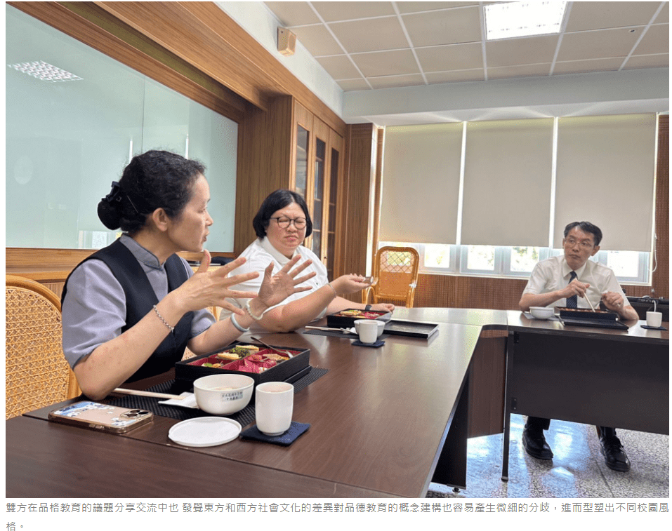 此次雙方在品格教育的議題分享交流中也發覺東方和西方社會文化的差異對品德教育的概念建構也容易產生微細的分歧,進而型塑出不同校園風格。但大家都認同品格教育無論是在家庭教育、學校教育的推動都需奠基在:大人要先以身作則。因為品格、道德教育是反映出家庭、學校對待學生的方式。