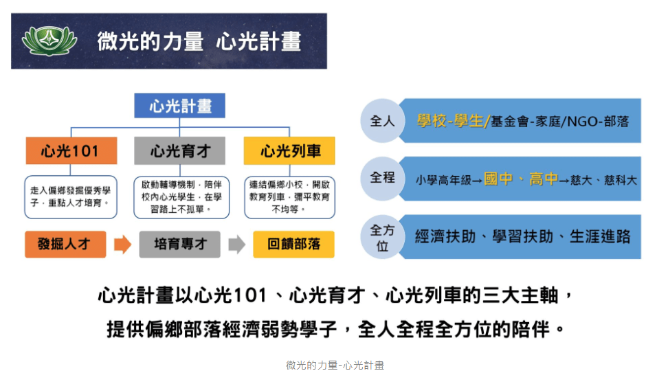 「透過教育的歷程改變一個孩子,是否就可以翻轉一個家庭?」慈大附中與慈濟基金會協力合作,將慈善與教育結合,推出「微光的力量-心光計畫」,主動走入偏鄉,除了提供部落學子獎助學金,也協助學生提昇學習能力並輔導其生涯規畫與發展,校長、導師與輔導主任更親自家訪,為家庭提供經濟及生活關懷,給予獎助生全程、全人的陪伴,期待透過教育,為部落暨偏鄉培育未來人才,點燃家庭與部落的希望。