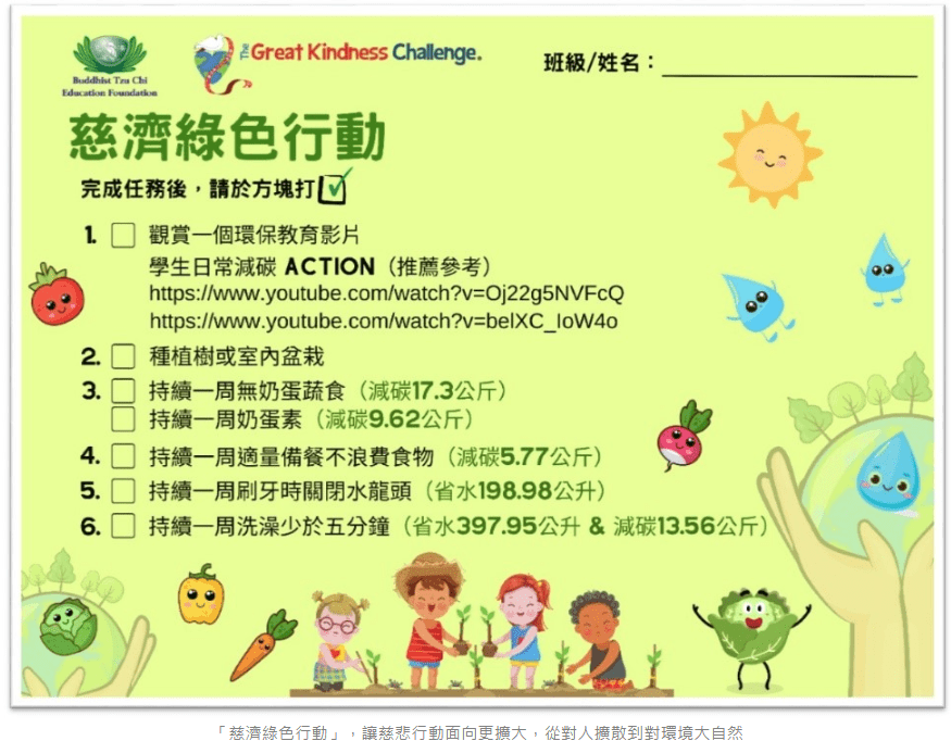 學校也連續三年參與全球慈悲大挑戰,讓學生從蔬食護生、落實環保,到服務社區銀髮、感恩父母親恩,在生活中實踐「孝親」、「同理」、「感恩」、「關懷」,更帶動親朋好友投入慈悲行動,並透過網路、臉書等媒體,串聯全球環境行動,擴大教育影響力,培養學生成為慈悲利他的全球公民。