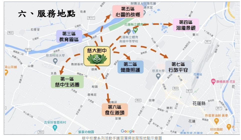 慈大附中每年的校慶以人文關懷、愛鄉愛土為思考,規劃「手護洄瀾」校慶活動,全校超過2000位師生,從幼兒園到高中與慈誠懿德會全員出動,掃街、淨灘,其範圍最遠到達七星潭、果菜市場等處,活動中除了清淨洄瀾,也以實際行動,感恩花蓮這片土地的滋養、感謝這塊哺育生命的大地之母。