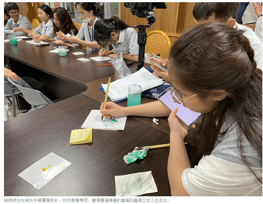 首先由臺南安平區書畫班陳東龍師兄指導越南師生在純白手絹揮灑色彩,如同青春無限,盡情揮灑青春的畫筆刻畫與立定人生志向。除體驗彩繪書畫外,也藉由此手絹創作來帶動環保意識,建立使用手帕的衛生習慣。來自海防陳富重點高中的范海安同學與范紅絨同學專注的感受畫筆筆觸及顏料渲染之美,細心描繪出蘭花的草葉姿態,親手繪製屬於個人專屬的手帕,海安更以流利的中文,表達對指導老師的感謝以及學校溫暖的招待,期許海安能將這份心情帶回越南,和同學們分享這一條手帕的故事,讓更多人認識慈濟人文之美。