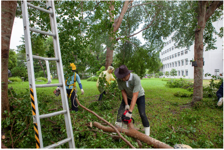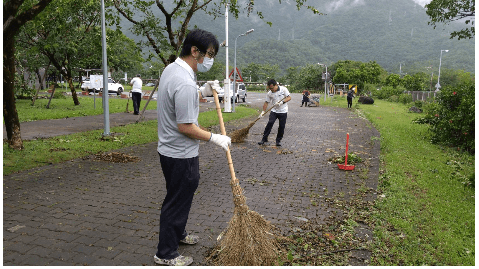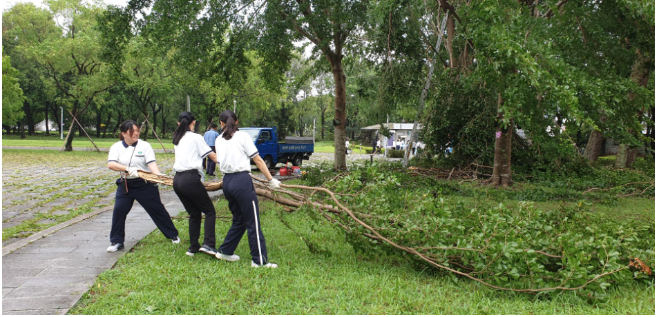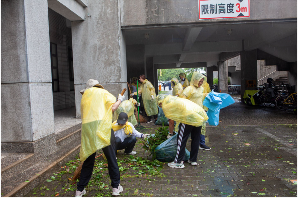 校園裡受風雨影響最大的是樹木,許多樹枝折斷、樹葉散落一片。大家分成不同小隊,清理機車棚、宿舍區和大門口等地點。有的人拿著夾子、掃把和塑膠袋,有的人協助移動樹枝,還有人清理地上的樹葉,以防萬一再度下雨,將排水孔堵住。