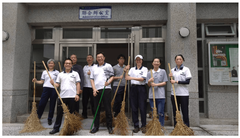 早上八點半,總務處準備好了清潔工具,同仁們紛紛聚集在大廳。總務長林珍如特別感謝這兩天颱風假期間依然前來幫忙的同仁們,並提醒大家打掃時要注意安全。