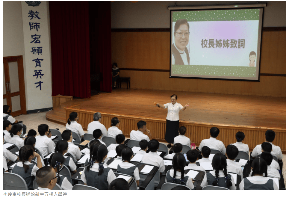 新生成長營一開始的開營典禮,校長姊姊送給新生的五樣入學禮。校長姊姊用心叮嚀,希望國一、高一的新生能將自己「重新歸零」(Reset),從尊重、守時(提早)、自信地展現到專注學習,各個面向都不設限,讓自己學習不後悔,美麗的綻放一次。