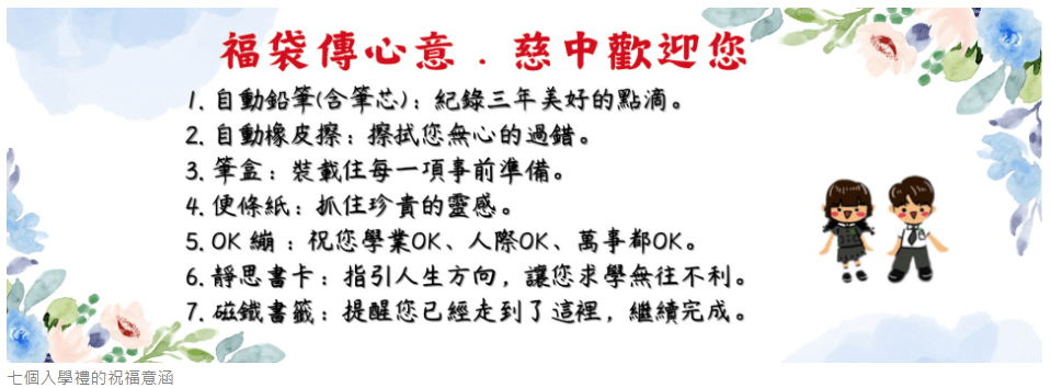 為了祝福新生加入慈中大家庭,慈中團隊特別準備了七樣富含重要意義的入學禮,期望慈中新鮮人都能獲得滿滿的祝福,用心學習。