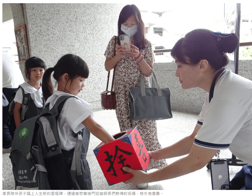 接著,由姚智化校長及主任們親自為孩子們別上領結,藉由「結」、「節」同音的象徵性意涵,期許小朋友都能成為有禮有節的好學生。最後,在拍照打卡區與家人留下第一天上學美好的回憶。