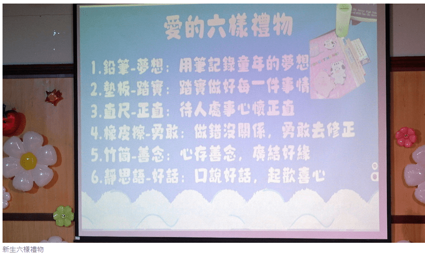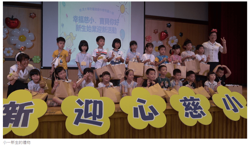 一年級導師也為每一位新生準備了六項迎新禮︰鉛筆代表記錄童年的夢想、墊板代表踏實做好每一件事情、直尺代表待人處事心懷正直、橡皮擦代表勇敢修正錯誤行為、竹筒代表心存善念,廣結好緣、靜思語是口說好話,起歡喜心。慈小師長為孩子送上大大祝福,期待學生努力的學習,快樂的成長。