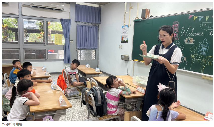 還有用餐禮儀「龍口含珠、鳳頭飲水」,打餐時不說話,用手勢比「多、少」來決定食物的量,以免浪費產生剩食,孩子們都很用心學習。一年三班高婭甯同學說:「今天我很開心!我學到了用餐前合掌唱感恩歌喔!」老師的用心教導,期待孩子學習儀軌,惜福愛物從小扎根。