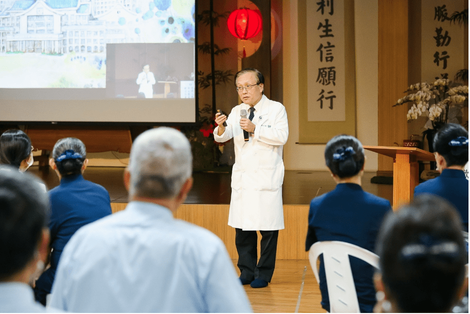 臺中慈濟醫院簡守信院長以幽默風趣又深具省思的分享,與大家講述當年已經是台大主治醫師的他到花蓮慈院服務的過程,他覺得自己比同時期的醫師是很幸運的,多了很多往診和與病人互動的機會,甚至還有很多機會到海外義診。最後簡院長用慈中、慈濟護專,慈大校歌歌詞勉勵祝福所有慈濟大學新鮮人,在中央山脈,太平洋旁,慈濟大學是來自全球慈濟人的祝福與寄託,期許新生們「誓願將心比心想,眾生平安,解我憂勞痛創,誓願眾生為至親,醫病醫心,獲得平安共享。」