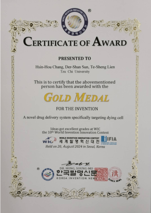 慈濟大學研究團隊以研究技術成果「受損細胞專一性藥物遞送系統」、「可溶性P選擇素作為一種新的用於骨髓幹細胞動員的藥物」二項研究成果參展,雙雙榮獲「金牌」。