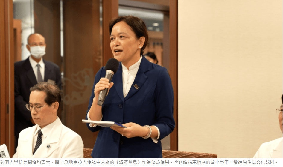 慈濟大學校長劉怡均表示,非常感恩瓜地馬拉大使館的信任,以及外國語文學系副教授石雅如的翻譯,催生出首本繁體中文童書版的《波波爾烏》,如實詮釋了「文化是最重要的外交力量」。不但將提供500本《波波爾烏》,贈予瓜地馬拉大使館作為公益使用,也將轉贈給花蓮、臺東國小的學童,讓偏鄉原住民孩童也能有所啟發,更強化族群連結,增進原住民文化認同。