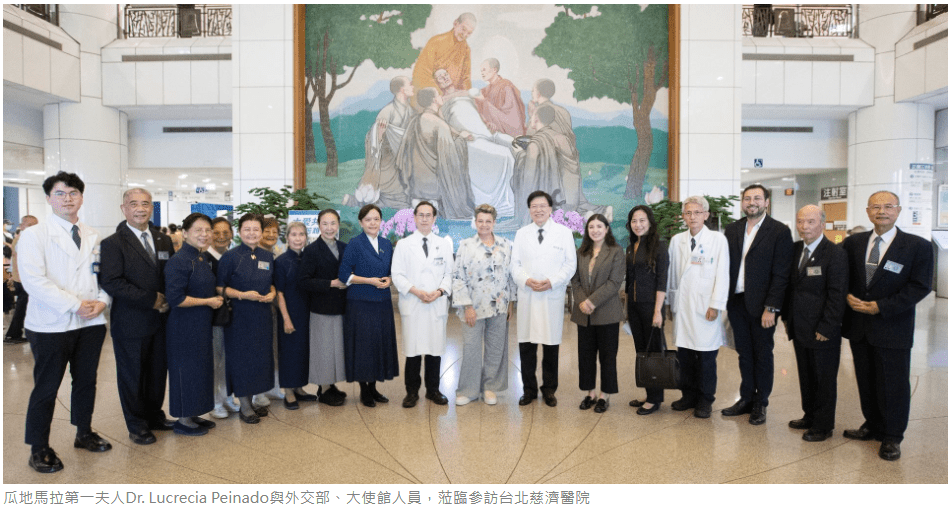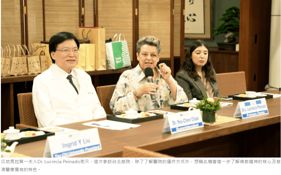 瓜地馬拉第一夫人Dr.Lucrecia Peinado表示,瓜地馬拉的挑戰就是病人和弱勢族群的尊嚴,我現在正在幫助肢體和智能障礙的人、老年人、0到4歲兒童的照顧以及提供婦女職業培訓等。這次參訪台北慈院,想藉此機會進一步了解佛教精神的核心及慈濟醫療獨有的特色。台北慈濟醫院院長趙有誠表示,證嚴法師創辦醫院幫助弱勢族群,用感恩、尊重、愛的精神來照顧這些病人,這也是我們一直以來努力的方向。