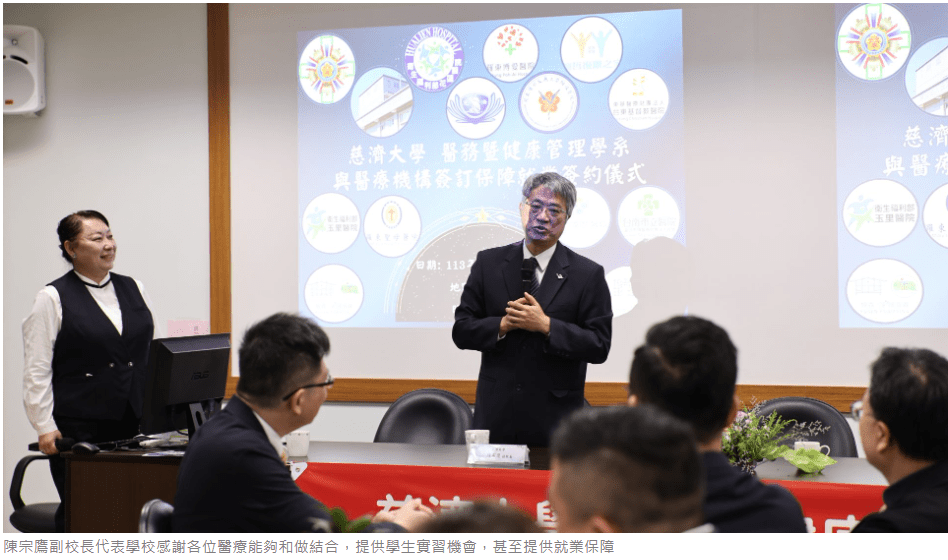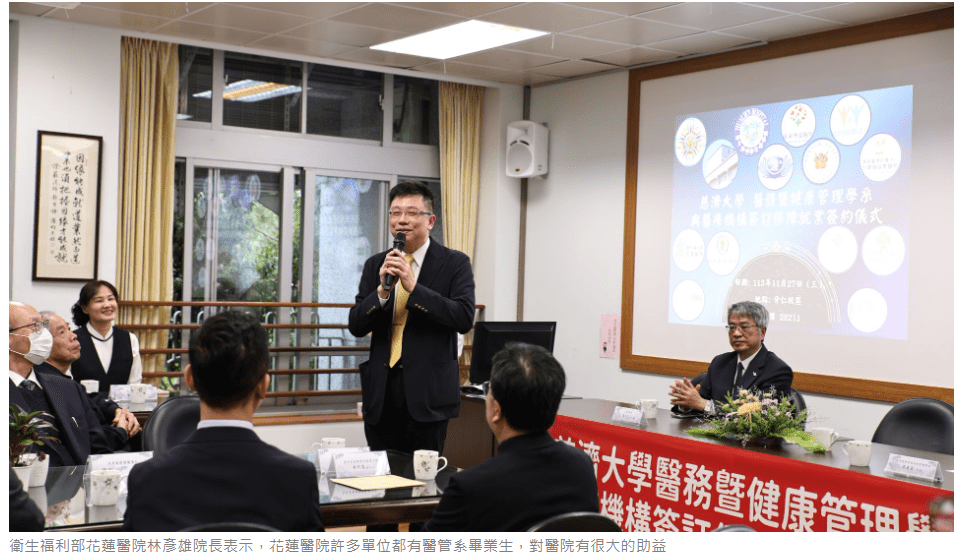 簽約機構之一的衛生福利部花蓮醫院林彥雄院長表示,花蓮醫院許多單位都有醫管系畢業生,對醫院有很大的助益,而慈濟的畢業生的效率及使命必達精神特別的高,因此希望未來可以有更緊密的合作。