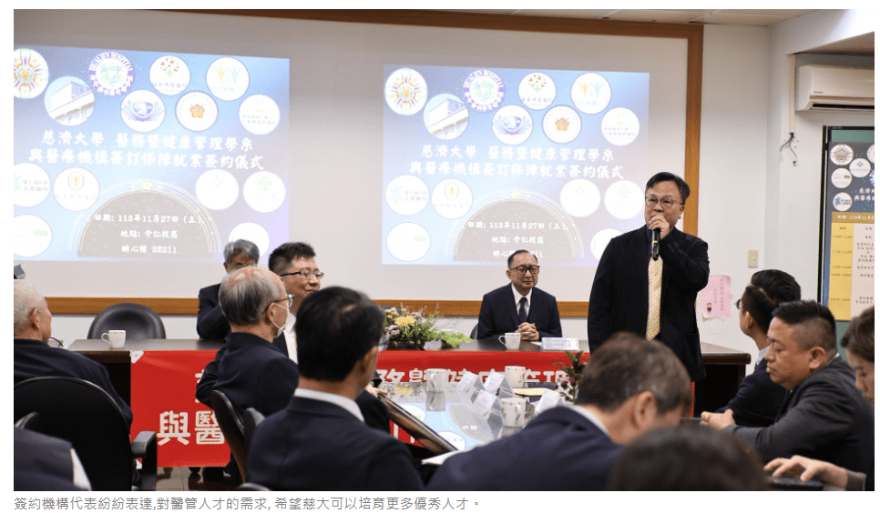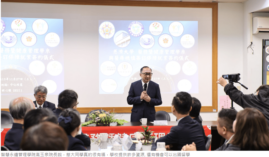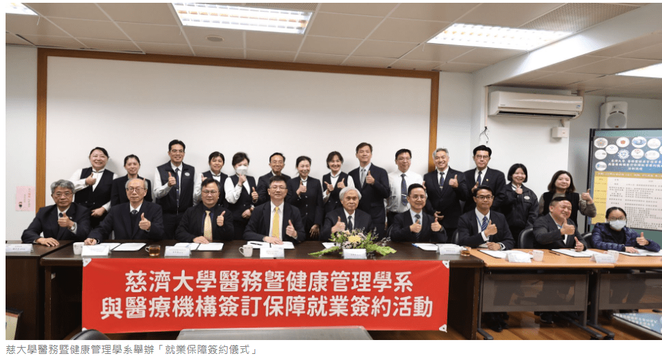 慈濟大學醫務暨健康管理學系於11月27日舉辦「就業保障簽約儀式」,透過與醫療院所、長照機構及健康養生機構簽定合作方案,讓學生可以安心就學,畢業後職涯無縫接軌。