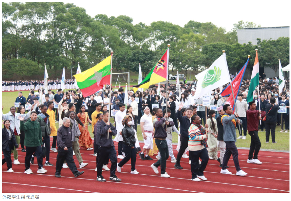 開幕典禮上,不同國家的國旗在場上飄揚,展現慈大的國際化和多元化,由親善大使、原音社與莫三比克共36位同學領唱校歌。校長劉怡均表示,今年八月一日合校至今,是慈濟大學3個月又27天,是慈濟護專創校35年,是慈濟醫學院第30年。要緬懷過去,更要往前看,開創慈濟大學永續發展的未來,讓TEAM TCU成為全球慈濟人引以為傲的大學,就像2024世界12強棒球賽奪冠的中華隊。