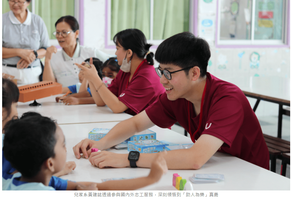 護理系學生管淮希分享,她在兒童教育及長者衛教服務中體會到不僅是知識與健康的傳遞,更是用陪伴與耐心讓受助者感受到溫暖與價值。兒家系的黃建誌則提到,透過參與國內外志工服務,他深刻領悟到「助人為樂」的真正意義,並認為每一次的服務都是自我成長的契機。傳播系的葛柔均則表示,透過與不同社會群體的接觸,她更能以多元視角理解社會現象,並在服務過程中發現自己的人生意義。