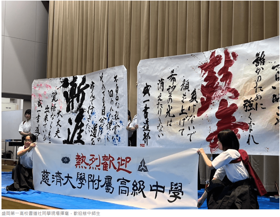 盛岡市與花蓮市於2019年締結友好城市,而岩手縣排名第一的盛岡第一高校,曾於2018年、2019年及2024年11月底三度到訪慈中交流,這一次,慈中終於踏上回訪之路。盛岡一高的同學不畏嚴寒,在校門口舉著手寫的歡迎牌迎接,甚至為慈中同學準備了寫著中文姓名的海報,讓大家深感溫暖。歡迎會上,盛岡一高的書法社同學現場揮毫,寫下「鼓舞」和「漸進」兩幅豪邁的書法作品。