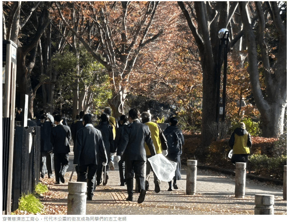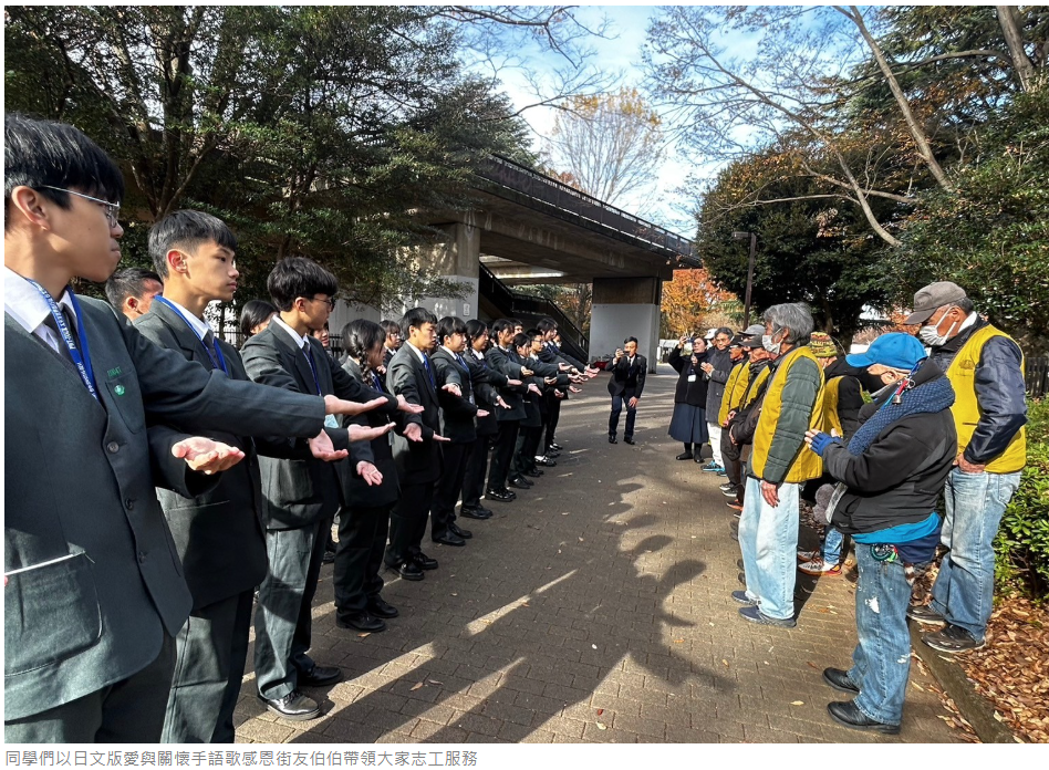 行程尾聲轉往東京,同學們在代代木公園進行國際志工服務,與街友一起掃街,服務結束後,同學們以日文版的「愛與關懷」手語歌,感恩街友伯伯們當他們的志工老師,並一起祈禱天下無災難。在東京,同學們也參訪早稻田大學、村上春樹文學館、日本奧林匹克博物館,另外也分組進行城市探索,培養自助旅行的能力。最後在慈濟東京分會,大家紛紛捐出身上的日幣,希望把愛留在日本,以回報這趟旅程中日本朋友與慈濟人們所給予的熱情接待與溫暖協助。