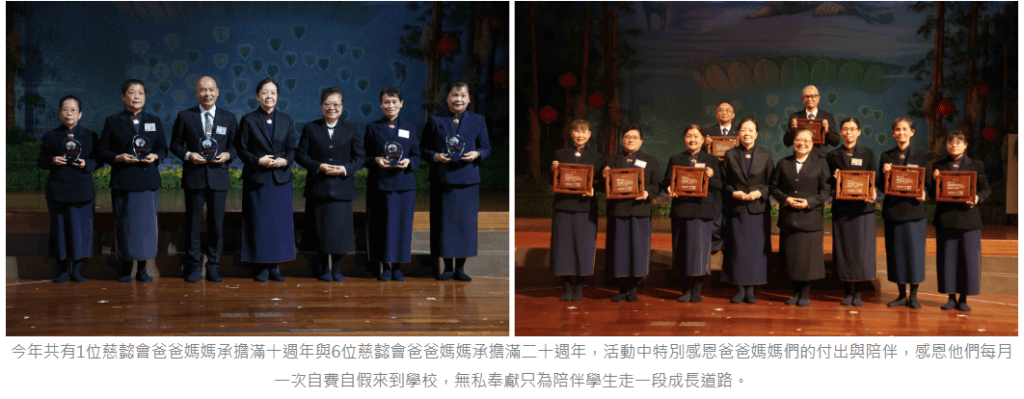 藉由今天的盛會,為慈中服務滿十週年與二十週年的慈誠懿德爸爸媽媽頒獎,慈誠懿德爸爸媽媽每月一次自費自假來到慈中,付出自己的青春陪伴慈中孩子成長,無私奉獻陪伴慈中學子。