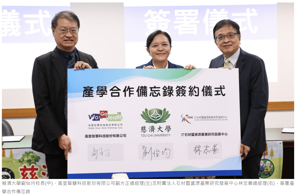 為結合學術界與產業界的力量,共同推動高齡健康科技的發展,慈濟大學劉怡均校長、高登智慧科技股份有限公司劉方正總經理及財團法人石材暨資源產業研究發展中心林志善總經理,於27日正式簽署產學合作備忘錄。