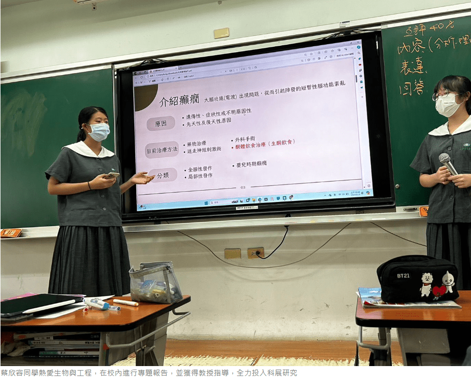 蔡欣容同學成功錄取國立中央大學生醫科學與工程學系,她表示感謝數理實驗班提供機會去成大生科實驗室,更感謝有成大陳少燕教授以及臺南慈中張宏州老師、林佳蓉老師的指導,有幸在台南科展獲獎。實驗班的特色課程,例如:生物醫學專題、科學專題等等的類似自主學習課程,能有更多時間去深入學習不同領域,也要謝謝學校老師們提供許多資源進行專題的報告,在實驗班不僅僅有讀書環境,還有更多摸索各領域的機會。