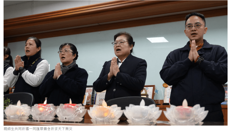 祈禱由校長帶領全校行政團隊及家長共同參與,大家雙手合十,心中默念祝禱,祈願災情儘速平息,災民能早日恢復正常生活。現場氣氛莊嚴肅穆,所有參加者同心協力為災區安穩和平而祝福。