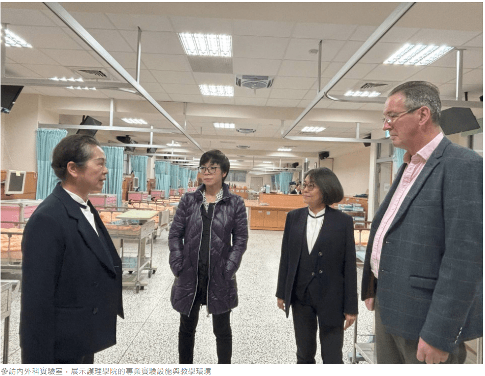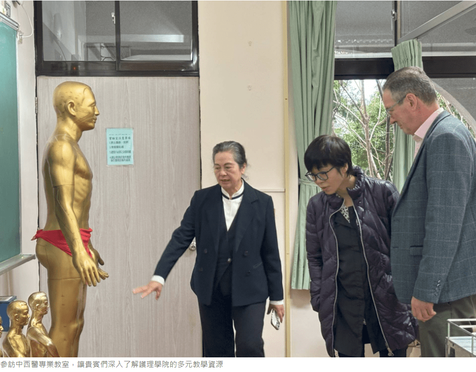 參訪過程中,張紀萍副院長介紹護理臨床技能中心OSCE測驗考場、專業特色教室(中西整合護理及多功能護理教室),此外,一行人亦參訪了專業基礎實驗室(基本護理實驗室、內外護理實驗室),展現了護理學院完善的學習場域及教學資源,提供學生更全面的學習體驗。