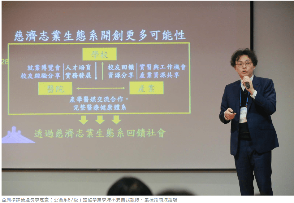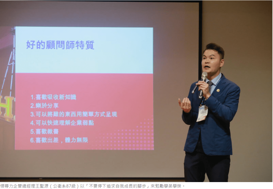累積許多管理認證經驗的領導力企管總經理王聖源(公衛系87級)表示,在專注於ESG與持續管理的創業過程中,需關注產業最新需求,再成為特定領域的專家,最後複製更多專家,打造更強大的團隊。王聖源清楚自己善於觀察、勇於表現、喜歡吸收新知識、化繁為簡、樂於分享的特質,更以「不要停下追求自我成長的腳步」來勉勵學弟學妹。