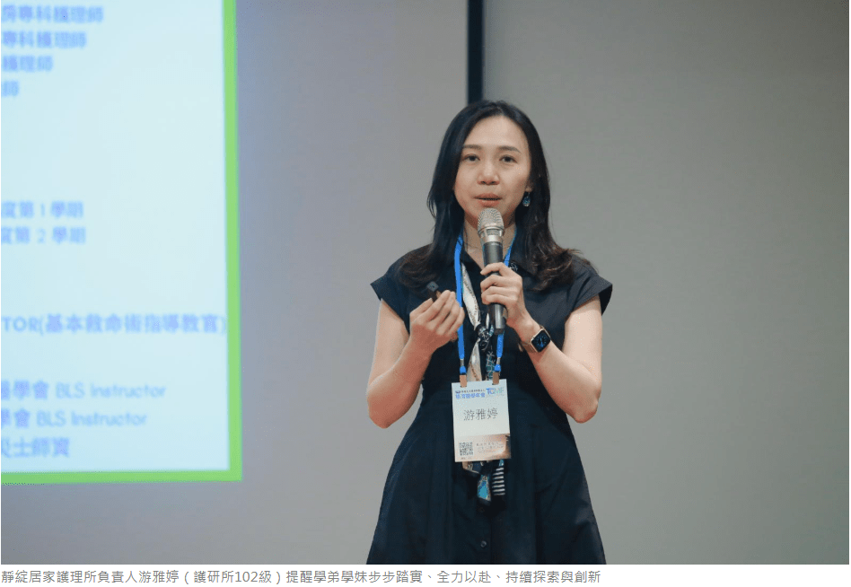 擁有17年臨床急重症照護經驗的靜綻居家護理所負責人游雅婷(護研所102級)分享,在宅急症照護(Hospital At Home)是透過視訊診療、遠端監測、智慧床墊等,讓上了年紀的病患在家治療,降低住院交叉感染的風險,也降低家屬離家入院照顧病患的難處。始終沒離開過護理職場的游雅婷,鼓勵學弟學妹畢業後,先到醫學中心歷練,然後步步踏實、全力以赴、持續探索與創新,就能在舞台上找到自己的位置。