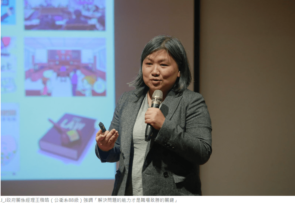 &J政府關係經理王楷皓(公衛系88級)分享,從10年公務員資歷練就一身能耐,再無痛接軌轉換私人企業的經歷。強調「解決問題的能力才是職場致勝的關鍵」,人生就是不斷的學習,隨時要有危機意識;每個工作都有其價值,不要跟他人比較;冷靜面對困境,才能走過人生低潮;學習接受不完美的自己,才有可能讓自己快樂。