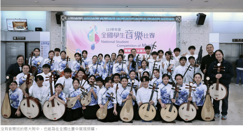 慈大附中於113學年度全國學生音樂比賽,再度打破記錄,同時拿下高中職B組國樂合奏、弦樂合奏、銅管五重奏,共三項優等佳績,展現深厚的音樂實力,綻放光芒,在各縣市音樂高手精銳盡出之下,表現相當亮眼獲得評委肯定,除了是對指導老師的肯定外,更展現孩子們平日認真學習的成果。