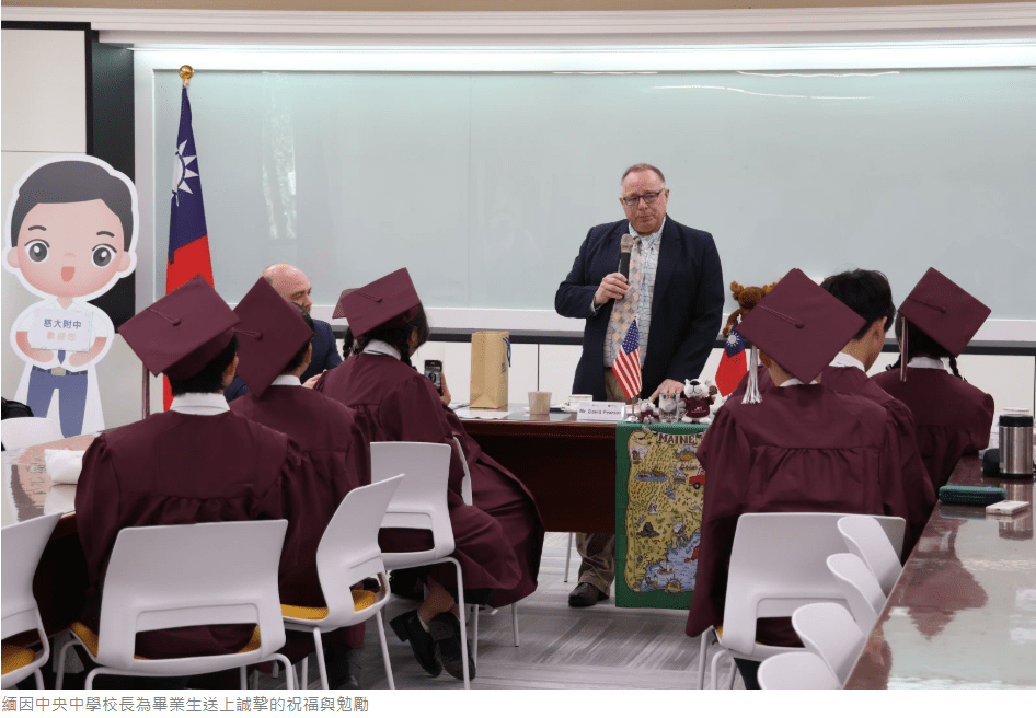 Pearson校長表示自己在線上長期觀察慈大附中同學們的表現絕佳,更以「Absolutely fabulous!」讚賞慈中的學生表現出色,充滿了學習的熱情,而參加雙聯學位就是要為自己開拓獨特的經歷,開展視野和不同的未來。在新的世代,科技有很大的影響力,但「人」具有更重要的意義,每位同學都是獨特的存在,所有獨特的存在共聚在一起,會讓世界變得更好、更有趣。即將畢業的高三學生將迎接新階段的開始,學習的重點不僅在於結果,而在旅程中的經歷,在挑戰中增長能力,祝福19位應屆畢業生展現自我。教務主任Mr. G溫馨提醒參加雙聯學位的同學就是緬因中央中學的學生,期待大家未來能回去造訪在美國的第二個家。