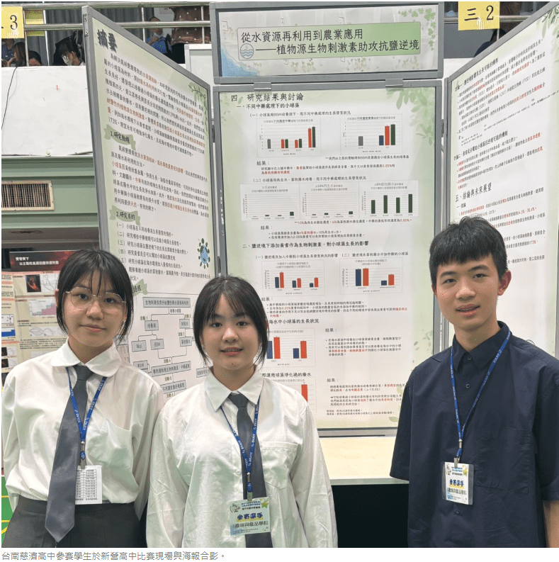 高二學生陳宣合、舒珞晴、蔡宗寬組成的研究團隊,以作品「從水資源再利用到農業應用——植物源生物刺激素助攻抗鹽逆境」,榮獲農業與食品學科特優(第一名),展現出科學探究的堅持與熱情,也為校史寫下了嶄新的里程碑。