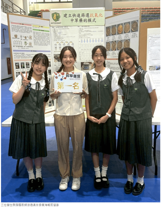 本次參展作品《建立快速篩選抗氧化中草藥的模式》,由國中部一年級學生黎襄君、王顗嫣與張羽涵共同完成,展現出年輕學子對生命科學的熱忱與科研潛力。