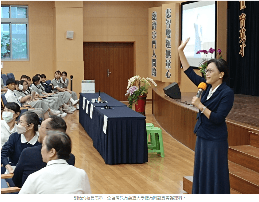 慈濟大學劉怡均校長表示,全台灣只有慈濟大學,擁有附設五專護理科。所以,慈大的學習資源非常豐富,有各學院的優秀師資、多元的社團,還有其他學院、系所學長姊的學習典範,以及海內外志工服務、出國交流的機會。世界這麼大,校長鼓勵大家走出去,拓展視野,接觸不一樣的文化。