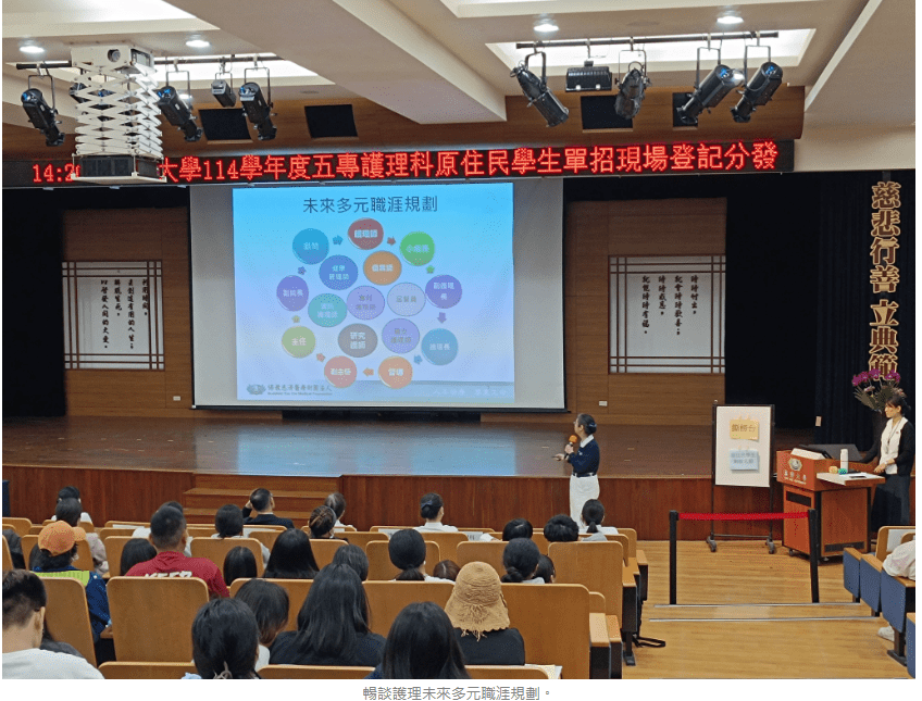 教務長謝坤叡表示,不管過去的學習是如何,來慈濟大學就是全新的開始。即使五專畢業後,還有二技、碩士班、博士班可進修,相信現在只是起點,未來還會更寬廣。護理學院彭台珠院長表示,選擇五專護理科是明智的選擇,至今已培育2,000多名原住民校友。只要考取護理師國考執照,等於是專業保障,不用怕失業,也是能一輩子帶著走的能力。