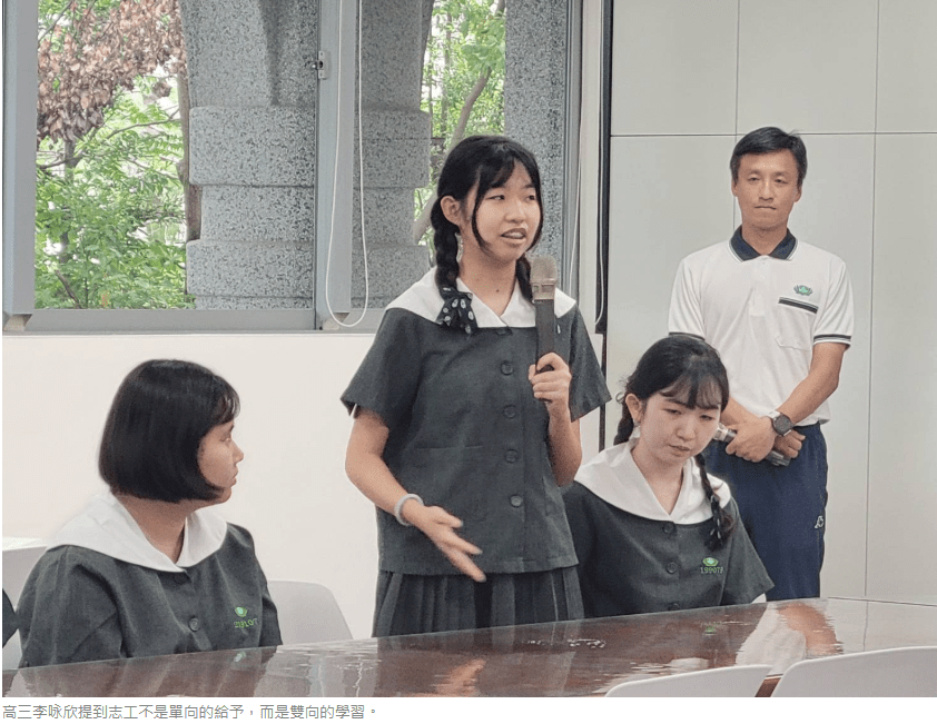 榮獲「傑出志工獎」的高三學生李咏欣,自小學三年級即投身志工行列,累積十年服務經歷。她分享「志工不是單向的給予,而是雙向的學習。」她曾在安養中心陪伴長者、參與偏鄉教學、疫情期間協助物資發送,每一段經驗都讓她更加理解人與人之間的關懷與連結。這些歷程也讓她確立未來志向,立志投身社會工作,陪伴更多需要幫助的人。