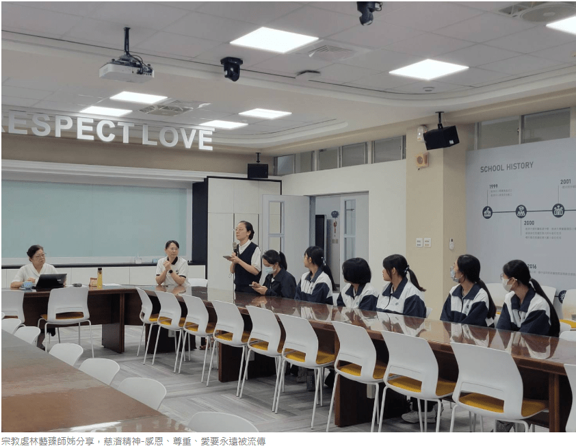 宗教處文教推展組林藝臻師姐分享,慈濟的精神一直是感恩、尊重、愛,學生有機會做志工,是因為前人累積愛的存款,我們才容易有付出的機會,做中學、學中覺、覺中悟,在志工行中能夠累積正能量,創造更多善的循環。