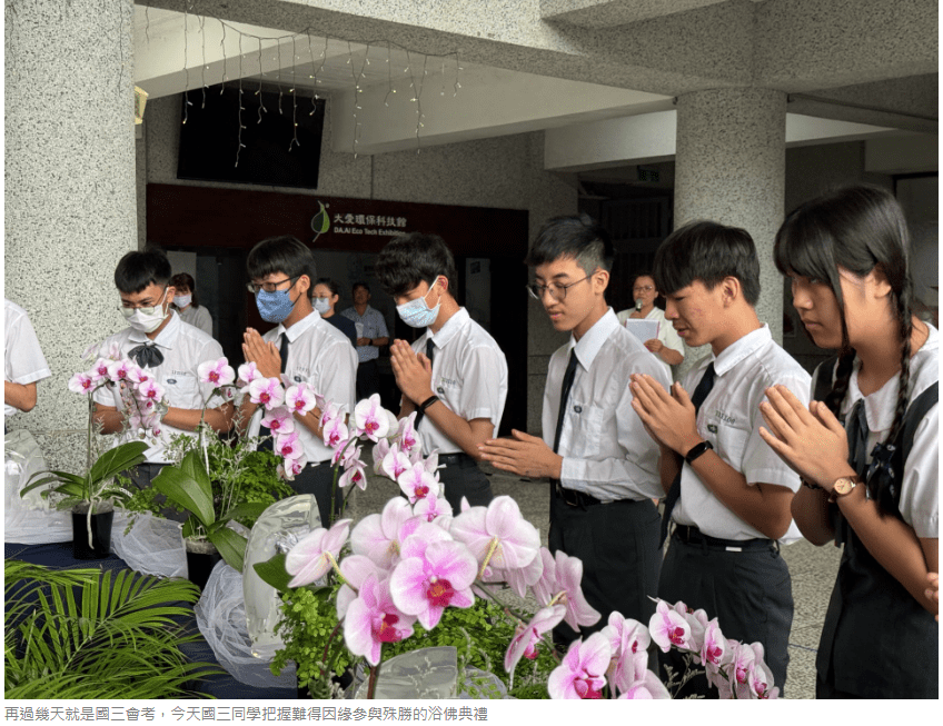 在會考前夕,國三同學把握這難得的殊勝因緣參與浴佛,在法師與師長的引導下,於佛前以至誠之心發願,為自己與世界祈福,期盼兩天後的考試能心無罣礙,發揮最佳實力。