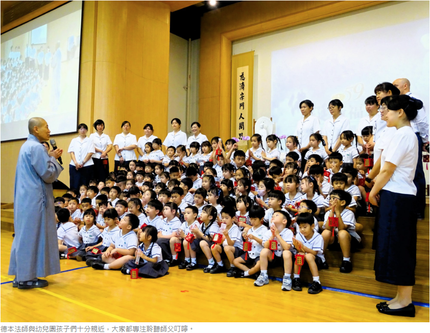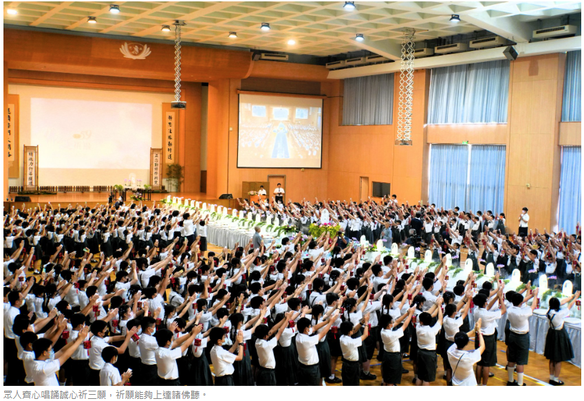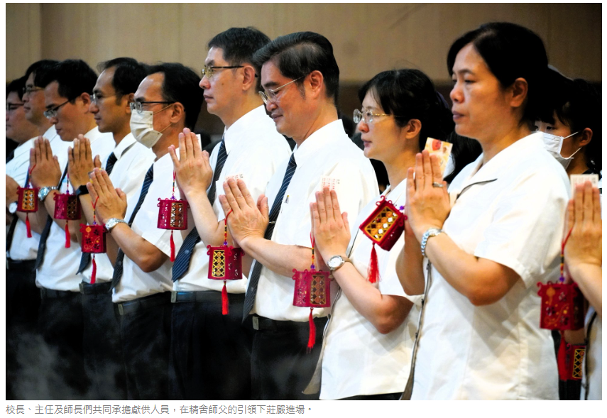 浴佛典禮在《無量義經˙德行品》梵唄的樂聲中揭開序幕,校長、主任、師長及國小部和高中部學生共同承擔獻供人員,在精舍師父的引領下踏著穩健的步伐進場,全場莊嚴肅穆,師生齊聲唱誦,內心專注誠摯,祈願人心淨化、社會祥和、天下無災。