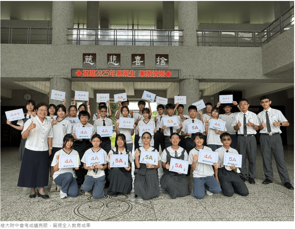 113年國中教育會考成績揭曉,慈大附中再傳佳績,全校平均每兩位學生中,就有一人至少有一科成績達A等級;每七位學生中,更有一人榮獲A++的優異表現。
