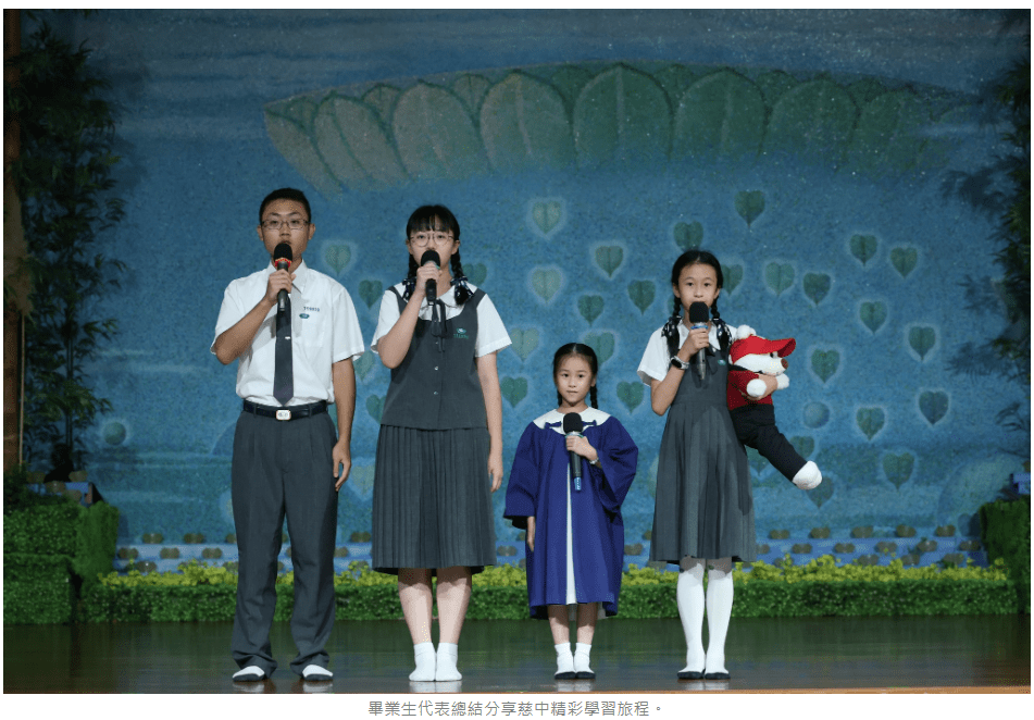「我來,我見,我征服!」高中畢業生代表王亮為用這句話總結三年來的努力與成長,從戶外探索到學測衝刺,每一步都踏實而有意義。他說:「在這個生生不息的校園裡,因為有師長、同學與慈誠懿德爸媽的陪伴,我們每天都懷抱夢想勇敢前行,帶著滿滿收穫結束一天。」幼兒園代表羅郁絜說,從一開始哭著害怕新環境,到學會照顧自己、自信在舞台上成果發表,雖然捨不得畢業,但會學著勇敢邁向下一步;小學代表林語桐抱著和土耳其滿納海學校交換的小熊「小海」一起上台,細數參加校際交流、國際修學團與英語劇演出的點滴,她誓願用行動實踐夢想,讓世界更美好。國中代表陳姵岑以流利臺語致詞,感謝導師與同學一路相伴,尤其在會考前獲得師長的支持與鼓勵,是自己最堅強的後盾。四位畢業生代表的分享不僅展現慈中學生的成長與自信,更傳達對師長、家長與慈濟人文教育的深刻感恩。