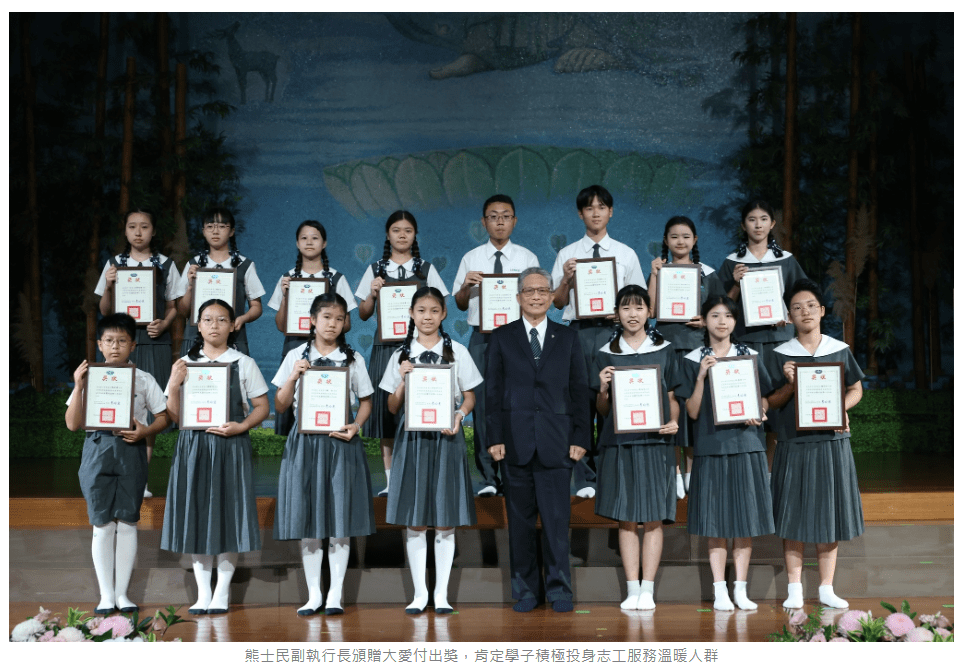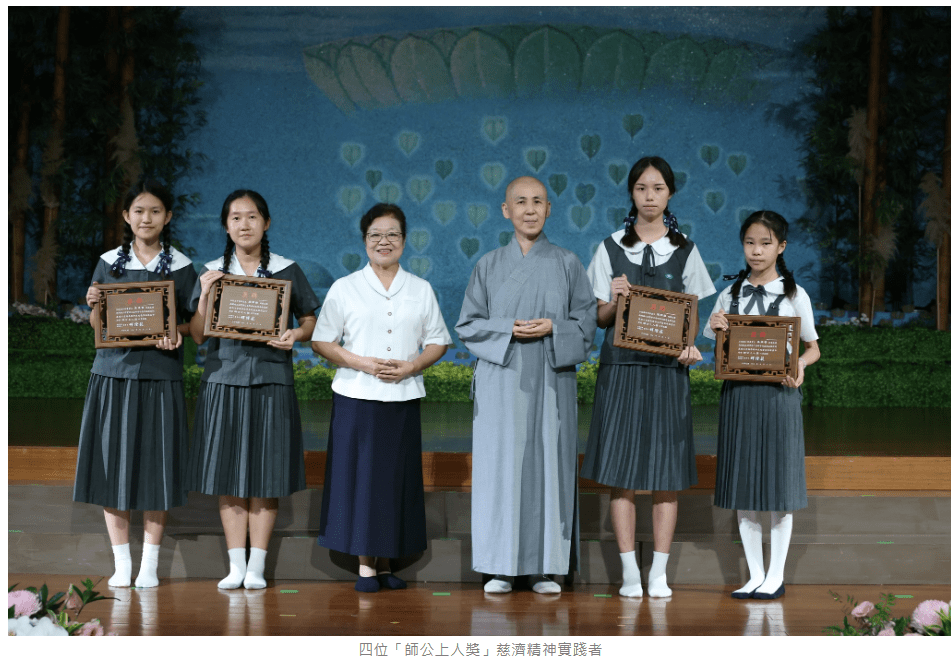 典禮上特別頒發「師公上人獎」給四位品學兼優、身體力行慈濟精神的學生。他們將慈悲與善行融入生活,在校內外默默付出、無所求。高中部的吳禹萱與周家榆積極投入各項志工行動,無論是環保志工、醫院志工、祖孫志工,還是擔任親善大使、參與國際交流,她們總是熱心地在人群中付出,樂在其中;國中部的陳玥霖則表示,志工服務讓她發現自己其實有能力幫助他人,也學會凡事用心、圓滿落實;而國小部的吳婉睿更是在年幼時便常隨父親參與義診與服務,她也立下宏願,要成為一位「無國界醫生」,用專業為世界守護健康。
