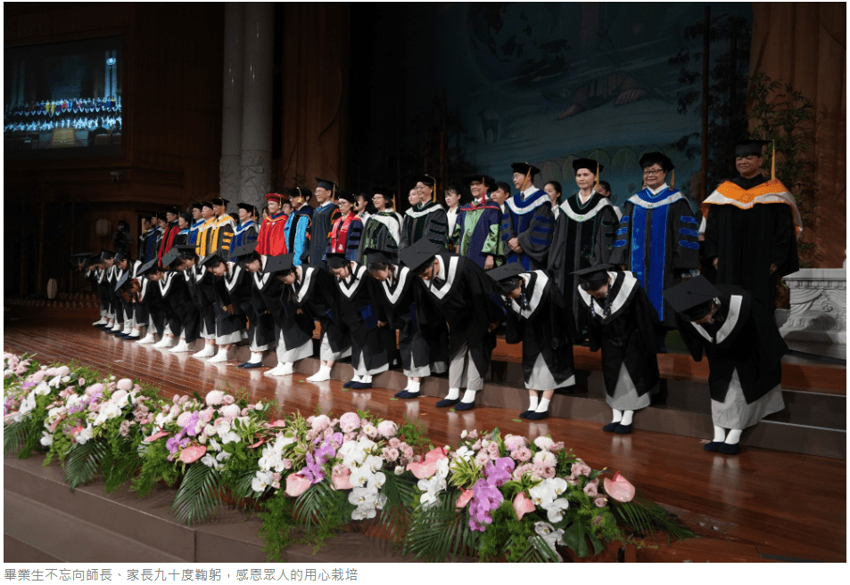 畢業生親自上台,逐一接受師長撥穗,頒發畢業證書,祝福展翅高飛,迎向人生下個階段。畢業生不忘向師長、家長九十度鞠躬,感恩師長、家人的用心栽培及支持。